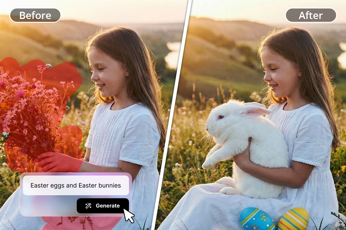 The easiest way to add Easter Bunny to a photo is by using an AI photo editing tool like PhotoDirector, which includes an AI Replace feature that automatically generates realistic objects inside images.