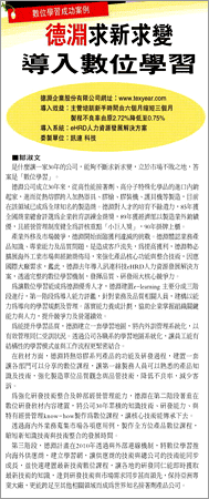 產業外移及市場競爭,德淵開始面臨獲利遽減的挑戰。德淵體認業務產品知識、專業能力及品質問題,是造成客戶流失,為提高獲利,德淵勢必擴展海外工業市場與經銷商佈局,來強化產品核心功能與整合技術,因應國際大廠需求,鑑此,德淵去年導入訊連科技eHRD人力資源發展解決方案,透過完整的數位學習機制,發揮品質、研發兩大核心競爭力。