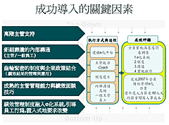 1. 爭取高階主管認同 2. 齒輪緊密的制度設計並與企業政策結合 3. 主管要有成熟的管理能力與績效面談技巧,以提高績效輔導與溝通成效 4. 要找到好的e化系統支援,由e化系統引導員工熟悉流程,並達到行為改變 |