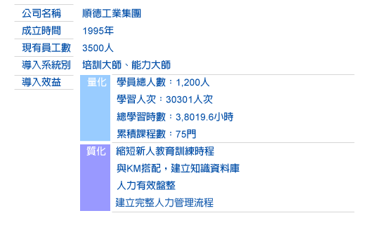 順德工業集團早在1990年即導入甲骨文(Oracle)企業資源規劃(ERP)系統進行企業內部之管理。後因遭遇成長瓶頸而決定調整經營策略,鎖定國際IDM大廠為主要客戶,並推動TPM(Total Productive Management)全面生產管理專案,希望提供給國際客戶更佳品質之產品。然新觀念的導入及習慣的養成須不斷的重複投入訓練資源,而受限於24小時輪班及跨廠區等問題,使TPM的推動成效不如預期。此外,順德的另一經營主軸─五金文具產品的生產製造多已移至大陸,使文具研發與業務部門的新進同仁缺乏現場作業實習環境,無從習得製程相關知識。因此,順德工業於2007年針對TPM與文具製程,規劃導入線上數位課程,期以數位學習的方式來徹底解決學習資源浪費的問題。