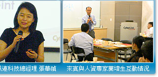 在知識產業掛帥的時代,人才是決勝的關鍵,HR的角色自然格外重要,但 HR 要處理的事務相當繁雜,所以資源必須做最有效的運用。張總經理一方面指出資訊化系統可降低行政作業負擔,讓HR把頭腦留下來做最有價值的策略思考,另一方面舉業界先進從CEO變成人資長的例子,鼓勵在場的HR朋友提高視野,多花時間處理思考性、分析性、創造性的事務。最後張總經理分享訊連科技的人才管理經驗,由於訊連的同仁普遍有年輕、好學、愛思考的特性,所以與他們溝通時必須要用新新人類的語言,如「英雄識英雄」的徵才活動,不僅打出2.0號召,更以時下最夯的峇里島Villa、數位產品做誘因,成效果然不同分享。