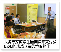 活動壓軸是由深耕人資領域近30年的蘭堉生顧問帶領大家,以雙向互動方式討論「HR如何成為企業的策略夥伴」。蘭顧問輔導過中外多家知名企業,當天他以業界資深從業人員的身分,回覆來賓在實務上常見的問題與困難,他不僅結合理論與實務闡述KSA和職能等人力資源管理概念,也簡明扼要勾勒出人力資源管理的四個角色:「策略夥伴(Strategic Partner)」「行政專家(Administrative Expert)」「員工代言人(Employee Champion)」及「變革代理人(Chang Agent)」,說明透過不同角色轉變,HR 如何一步步邁向企業一線的業務夥伴。