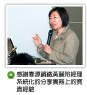 春源鋼鐵落實接替人選計劃 成功度過轉型挑戰 緊接著由春源鋼鐵黃麗玲經理分享在人才管理的實務應用經驗,春源鋼鐵不僅是2008年人力創新獎得主,也獲得2009年企學網「企業運用數位學習最佳典範獎」的肯定,在人才管理上的成就有目共睹。