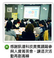 在熱烈討論聲中,本次人資菁英會也到了尾聲,從實務分享到專業知識的系統化思考,人資夥伴們帶著滿滿的收穫並思考各自企業的應用課題。本次活動報名相當熱烈,顯見台灣企業已體認到人才管理與接班人計劃的重要性,訊連在2010年將以人才管理為主軸舉辦一系列活動,協助人資朋友們解決問題,也讓我們共同期待第二季人資菁英會的到來。