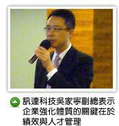 研討會一開始,訊連科技吳家寧副總便指出,訊連在不景氣的時候仍然獲得許多肯定,不僅榮獲美國2009 Brandon Hall卓越學習技術大獎,在今年5月遠見雜誌TOP 100 CEO評選中,訊連亦名列其中,這背後的關鍵在於績效與人才管理。 績效管理制度可以幫助企業落實人才管理與組織目標,但在導入績效管理過程中,HR必須思考企業制度的設計能否幫助企業找到真正人才、企業發展方向與員工個人目標能否結合、個人績效與組織績效如何才能同調等諸多議題,如此才能讓績效管理真正發揮效用。