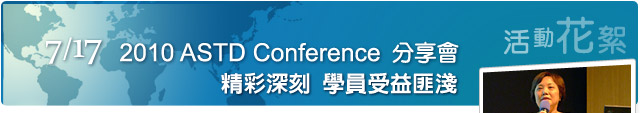 由社團法人中華人力資源管理協會舉辦之「2010 ASTD Conference 分享會」於7月17日上午於信義學堂登場,會中邀請多位資深之業界專家,就參與五月份於美國芝加哥ASTD會後之心得及融合各面相學習後之經驗,與現場人資界的朋友進行交流。在中華人力資源管理協會陶尊芷理事長於每段演講後,信手拈來地以家人相處為例子的穿針引線中,學員不僅迅速吸收到各位講師的精華,更能馬上對應到在職場上該如何應用的決策。