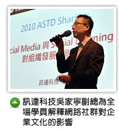 ASTD的年度大會是每位HR都很嚮往的朝聖活動,所以每年協會都會請一些能夠到現場參加的成員們分享聽到最新、最精闢的觀點,讓向隅者也有機會可以一窺新思潮。本次分享會首先由訊連科技人力資源暨eHRD吳家寧副總經理以「Social Media與Social Learning對組織發展的影響」為題,介紹目前銳不可當的網路社群力量,以及這項工具對企業的影響和該如何相對應的變革。吳副總以訊連為例,表示除了隨時關注網路上對公司的評論外,更善用社群網站來加強企業的學習與溝通。然而近幾年類似的網路資訊流通案例層出不窮,從最近知名手機收訊不良的風評危機,到網路標價錯誤等的嚴重公關事件,對於如海嘯般的網潮議題,無論是在傳播速度、管道、內容等等都會是目前企業必需要正視的課題。企業如何依自身的需求與文化來考慮開放與否及開放的程度,都是這次大會中小組所熱烈討論的題目。