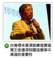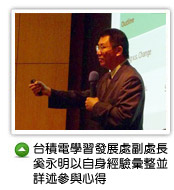 變革就是溝通再溝通 第二場精彩的演講由台灣禮來資深訓練發展部門王金連協理主講。王協理有著多年人資處理的經驗,然而近年由於醫療業的銷售困境與規則的改變,無論是參與國內標竿學院的課程或是向外取經,王協理皆積極參加,期待找出解決方案。這次分享會於演講一開始就針對「變革管理的迷思」題目,以「變革」最重「communication」來破題,重申變革的課題沒有萬靈丹,即便在無數次的溝通後,還是要再次溝通的重要體認。在美國參與二天的課程與討論中,小組曾針對「為何要改變」以及「調和與重新檢視企業狀況」花了最多的時間討論。因為面對改革,除了阻力一定很大外,期待一下子就能改變的想法也是不切實際,人性面與制度面必須是不停地「溝通」才可折衷平衡。當找出企業的核心價值且堅定不移後,在原有的基礎上,由中間支持者開始進行變革也是王協理在ASTD會議中,所領悟出的珍貴方法與感想。 省思自我的五種要點 第三位講者台積電學習發展處奚永明副處長上台即詼諧的說,分享內容一半是上課所學,沒有印製講義,而且他認為當學員認真聽講時,比任何筆記都來的有收穫。但是豐富的簡報內容還是讓學員們一邊豎耳聆聽,一邊振筆疾書,深怕漏了業界深名遠播的奚副處長開講。這次會中除介紹在評估公司改革上的五項指標(Awareness、Desire、Knowledge、Ability、Reinforcement)外,也建議學員可以實際運用在自己公司中。奚副處長並提供學員們五個要點,讓學員可以回去「做功課」好好思考。第一為你想計畫去影響什麼;第二是使用一個有用的行動方法;第三是在參與訓練後的二週內就應採取行動;第四是有意義的一擊(英文簡稱為SOS,是指在訓練中,學到最有意義的一點);最後則為進一步的學習主題為何。這樣的原則隨時都可以實踐運用,以今天的分享會來說,能在三天後與人分享並侃侃而談的內容,一定是當天自己吸收到最多的要點。