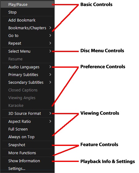 The express menu provides quick access to many of CyberLink PowerDVD's controls and playback features during playback. To access it, simply right-click the mouse button on the media window during playback.