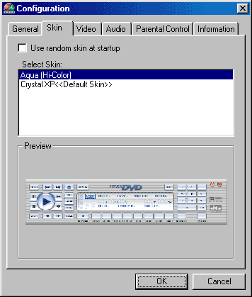 Once you have extracted the skin file to the appropriate folder, you can now take the necessary sets to activate your skin. First though, you will need to launch PowerDVD XP 4.0. Once the main User Interface is open on your desktop, click on the Configuration button (or press "Ctrl-C"). The Configuration menu will open up and here you will want to select the Skin tab. At this point you can see the name of the skin you just downloaded, and all other skins currently available. Select the skin and then click "OK".