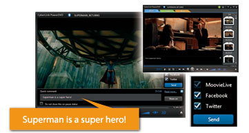 Integration of social networking features like "Quick Comments" allows consumers to share their movie experience with friends as it happens. PowerDVD enables the publishing of tweets to Twitter and status updates to Facebook as a movie is playing. |